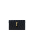 Leather Monogram Wallet by Saint Laurent, front snap-button closure, quilted leather-print design, card slots, four open pockets, one center zippered pocket, interior brand logo, iconic gold applique logo plaque on front, gold chain with leather handle.
